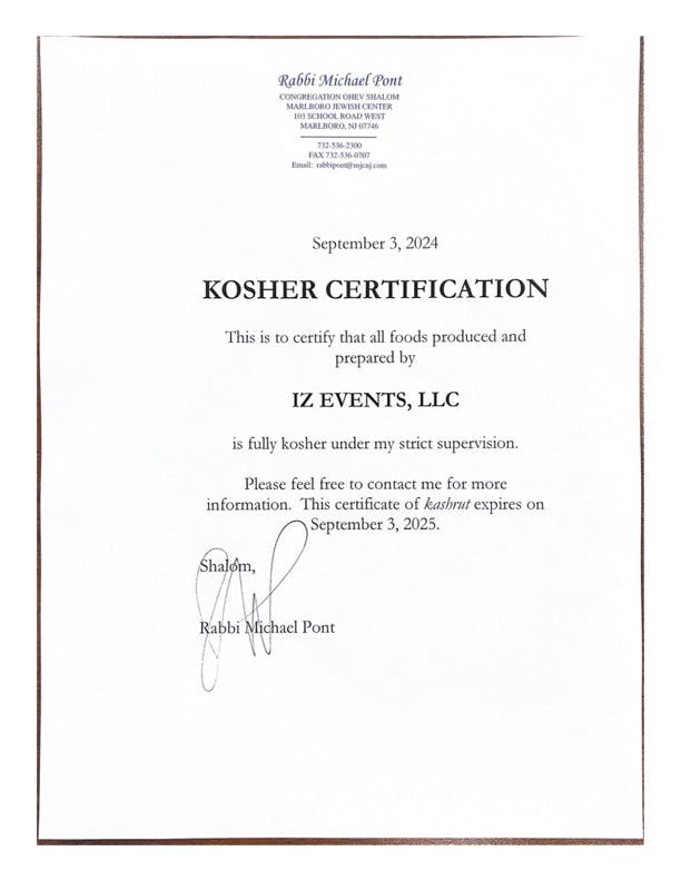 IZ Events is under the strict supervision of Rabbi Michael Pont of the Marlboro Jewish Center. Glatt Kosher supervision is available through collaboration with Park East Kosher under the Chof K supervision.